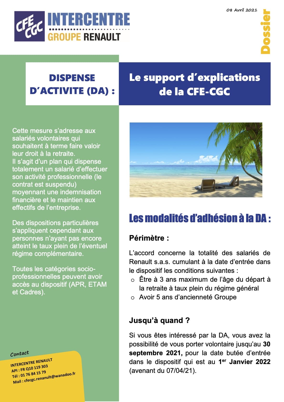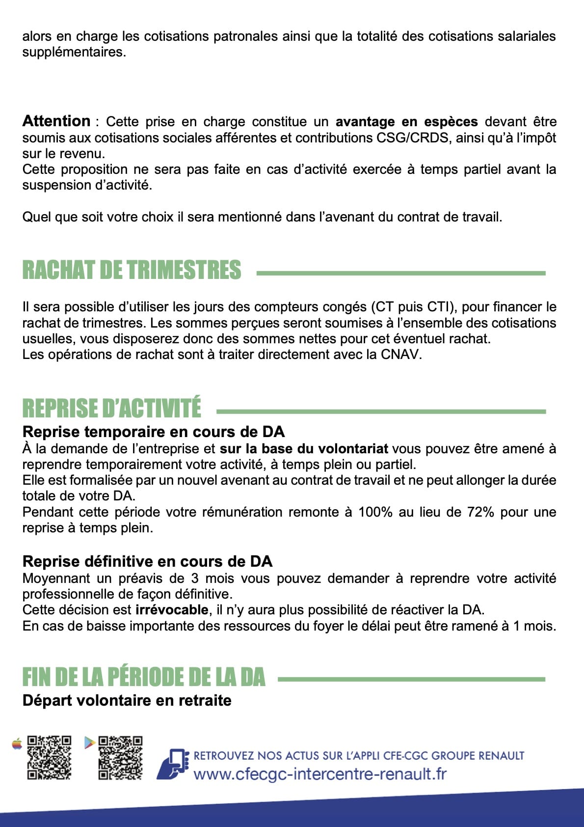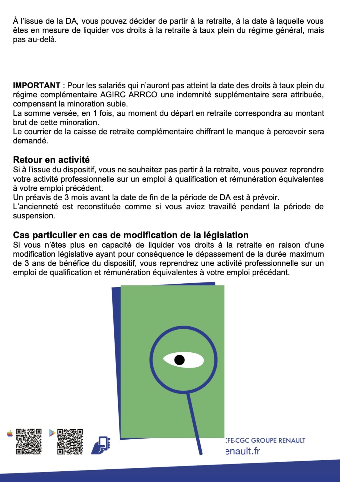 R : Non, aucune modification n’a été apportée au dispositif de la Dispense d’Activité qui permet d’arrêter toute activité avant la date à partir de laquelle le salarié peut faire valoir ses droits de départ en retraite. La RCC-DA concerne les personnes ayant déjà atteint cette date mais n’ayant pas souhaité faire valoir leur droit jusque-là.