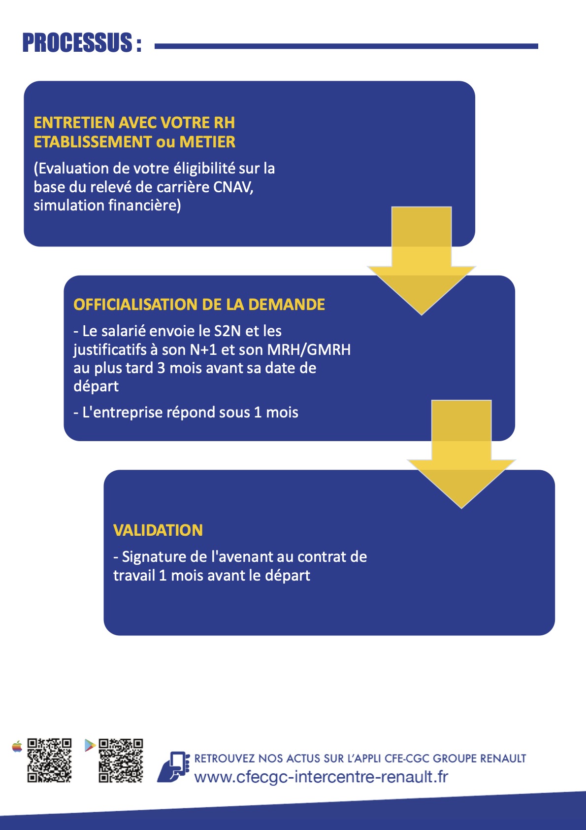 R : Non. Les postes bleus ne sont pas éligibles à la RCC. Je peux partir en retraite mais sans bénéficier des aides de départ Renault, car Renault considère qu’il a besoin des compétences de mon poste sur le long terme.