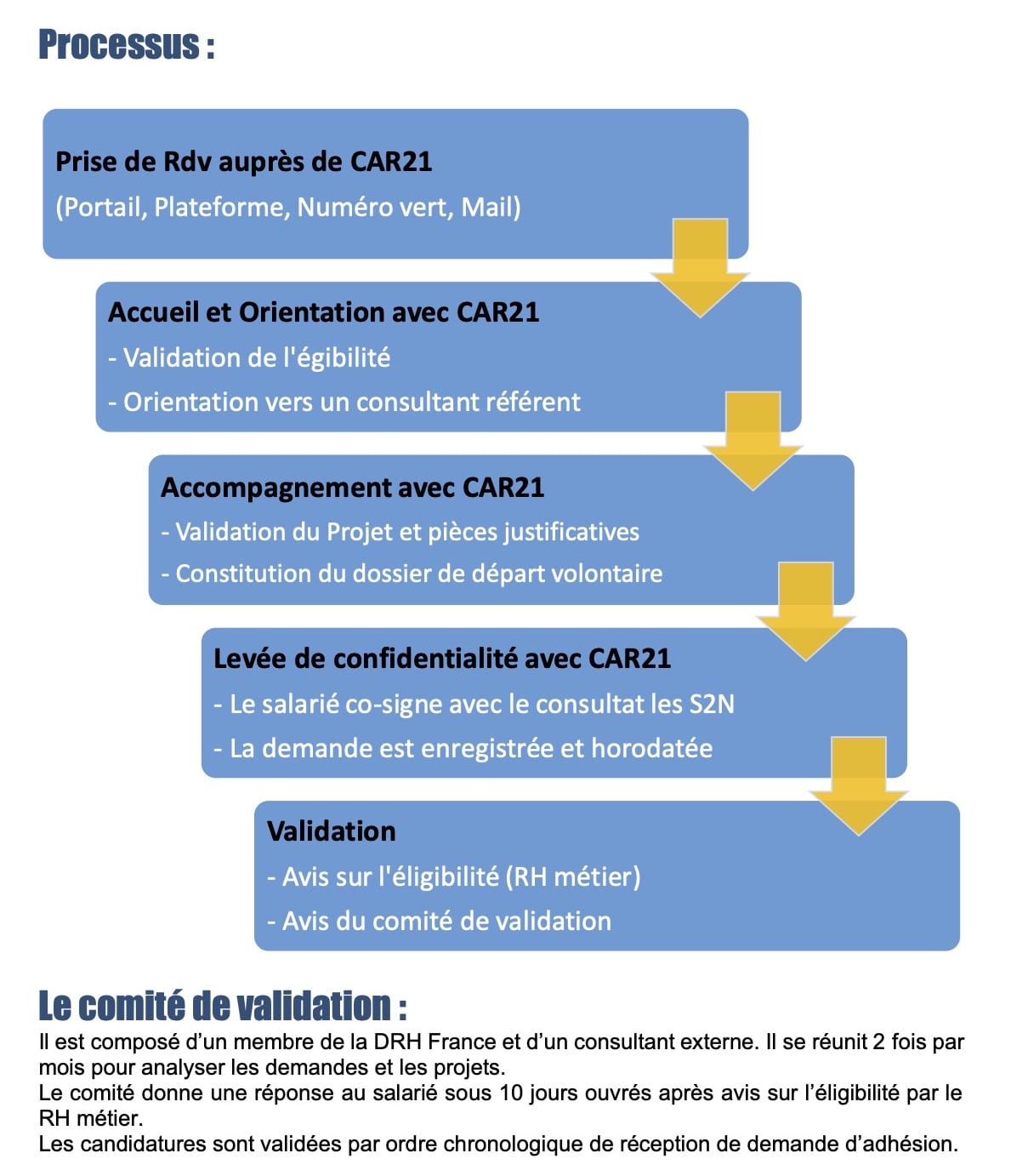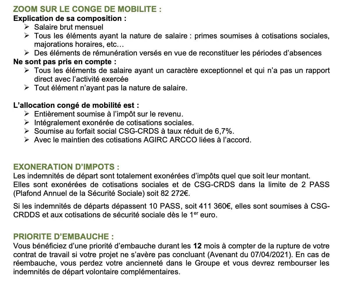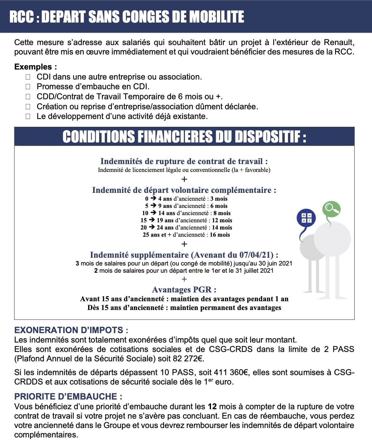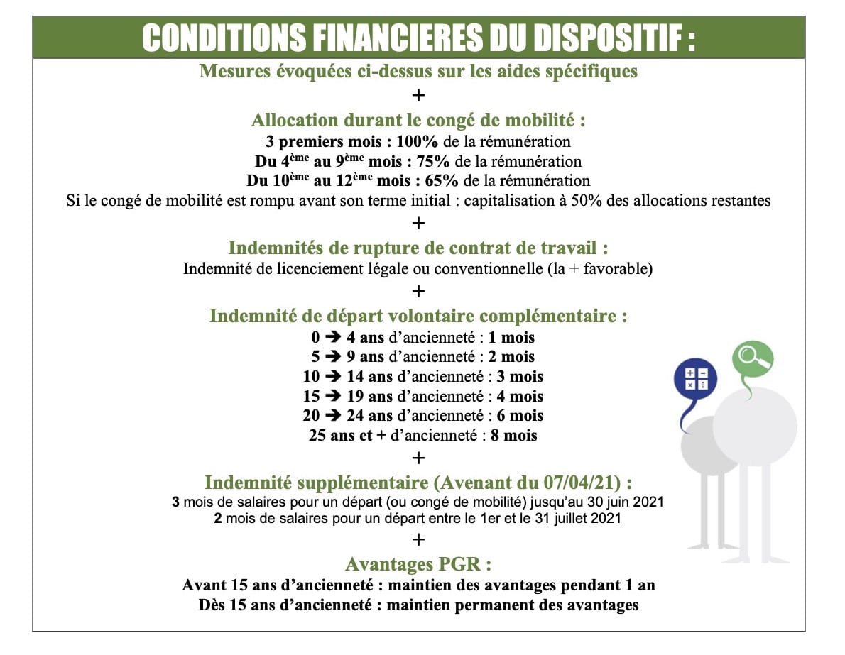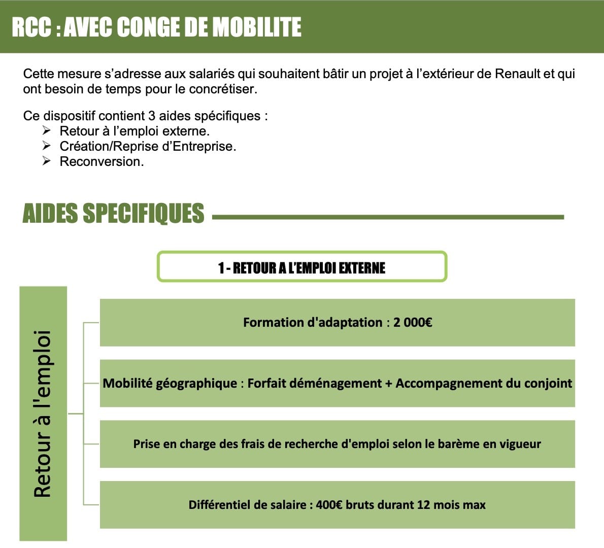 R : Le dossier permettant de bénéficier de la RCC et du congé de mobilité fait l’objet d’une validation qui prend en considération sa viabilité. Toutefois malgré ces précautions, quelle que soit sa situation et même en l’absence d’emploi, en fin de congé de mobilité le salarié quitte les effectifs de la société. En effet la fin du contrat de travail est actée dès la signature de la convention individuelle de RCC. Il est cependant prévu pendant 6 mois une priorité à la réembauche sur un recrutement externe pour lequel le salarié aurait les qualifications requises.