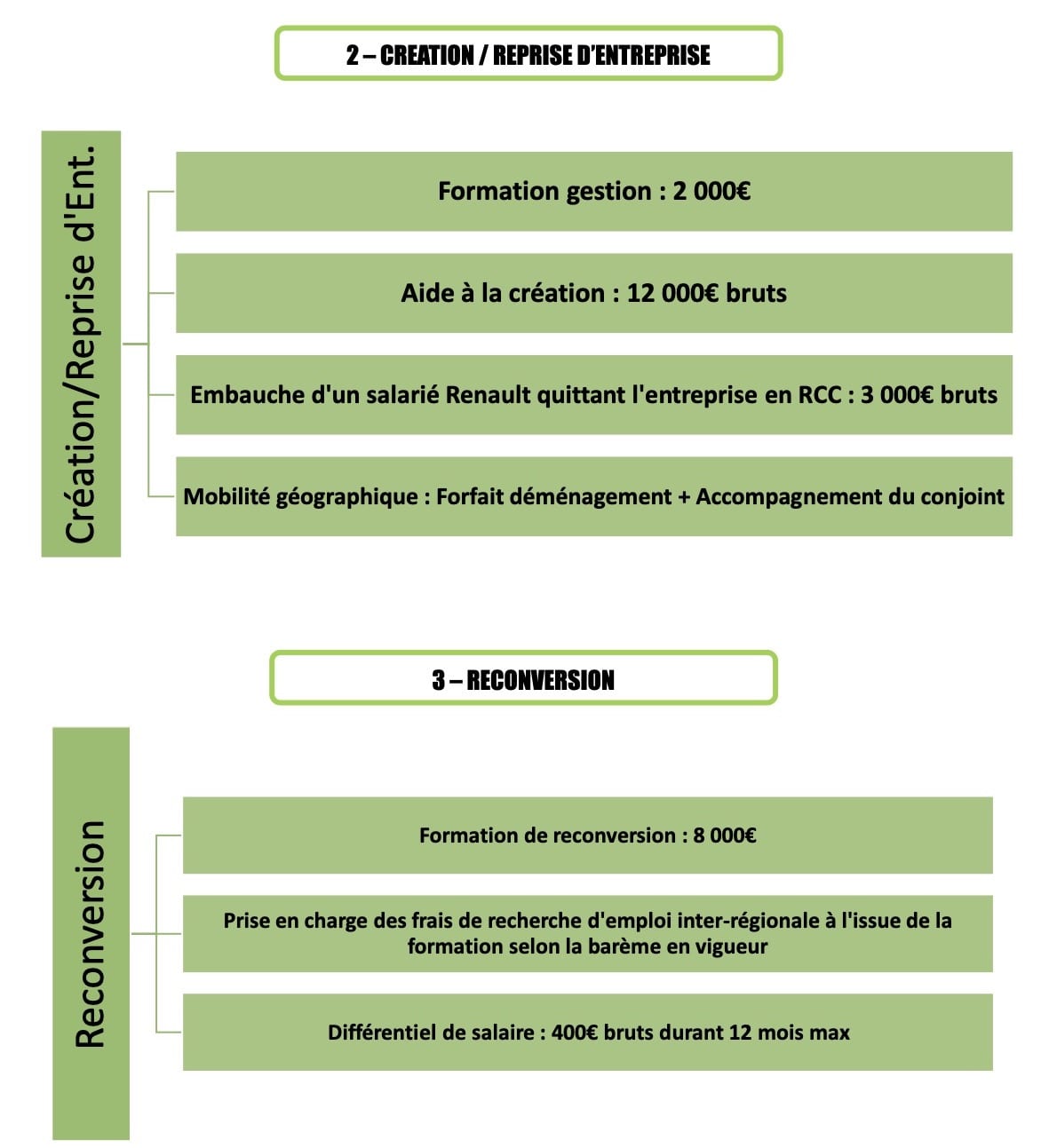 R : A sa sortie des effectifs de Renault sas, le salarié reçoit tous les documents de fin de contrat habituels, dont une attestation Pôle Emploi. Selon les règles habituelles de l’UNEDIC, il a droit à une couverture chômage (à vérifier individuellement car fonction de la durée de cotisation chômage). Selon le site de l’UNEDIC, il a 12 mois à compter de son départ pour constituer son dossier auprès de Pôle Emploi, à défaut ses droits tombent. Pour des salariés qui créent une société il est conseillé de prendre contact avec Pôle Emploi car il existe des aides potentielles de complément de rémunération. Ce sont des règles très spécifiques et Pôle Emploi est le mieux placé pour conseiller en fonction de la situation.